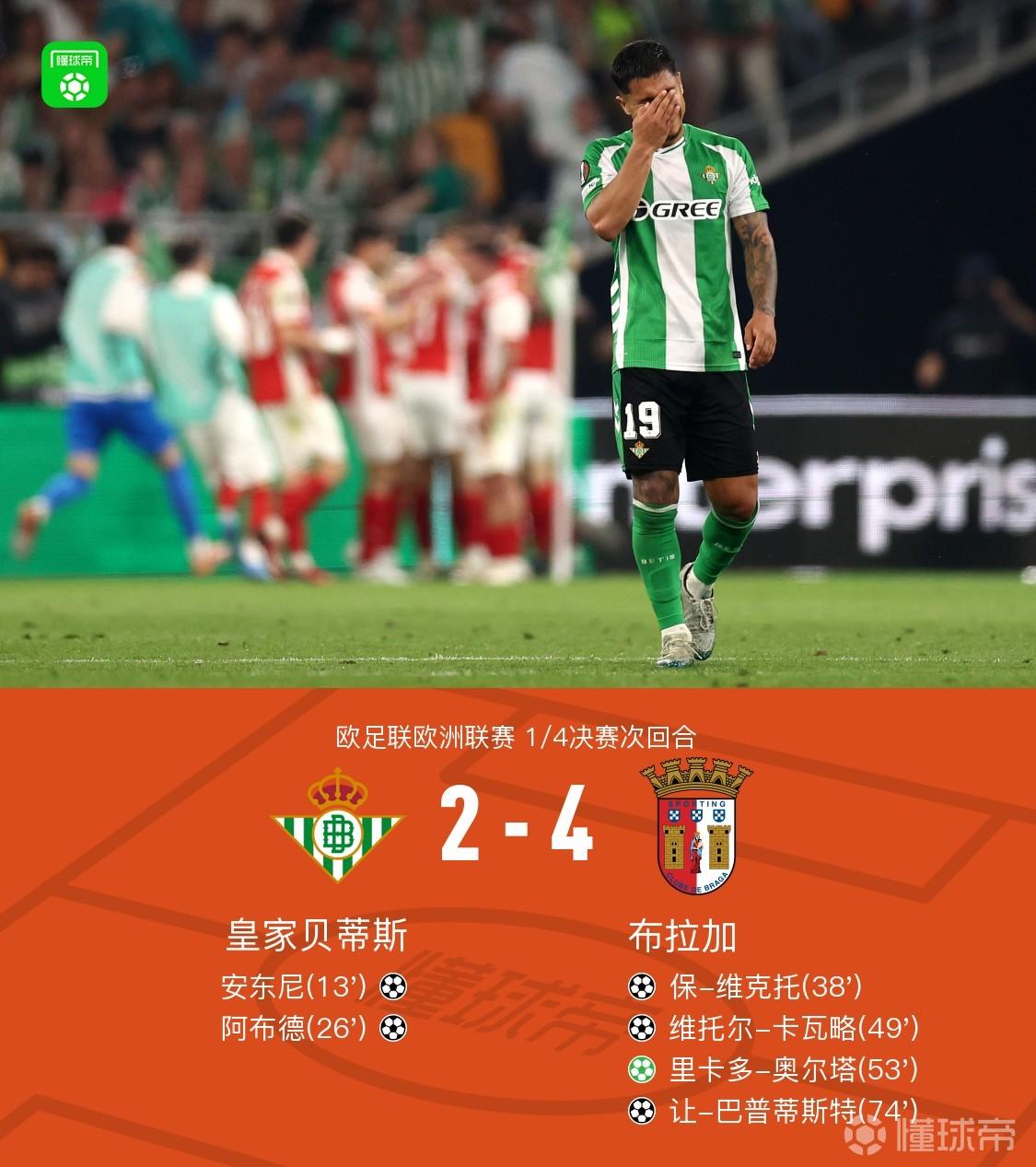 北京时间4月17日欧足联欧洲联赛 1/4决赛次回合,皇家贝蒂斯对阵布拉加。皇家贝蒂斯安东尼破门,阿布德破门。布拉加保-维克托破门,维托尔-卡瓦略破门,让-巴普蒂斯特破门,里卡多-奥尔塔破门。最终比分皇家贝蒂斯 2-4 布拉加。两回合总比分皇家贝蒂斯3-5布拉加,无缘四强。