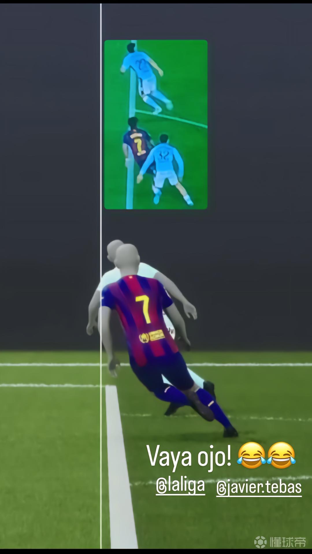 赛后,费兰-托雷斯更新社交媒体动态,晒出了VAR越位划线图,写道:“好眼力!(Vaya ojo!)”并艾特了西甲联赛官方账号和西甲主席特瓦斯。